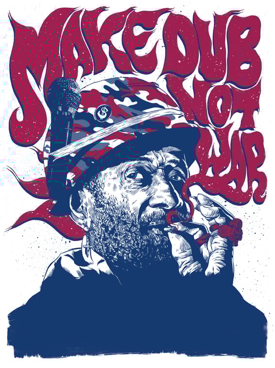 Official 'Make Dub' T Shirt for the legendary Upsetter, Lee 'Scratch' Perry. Designed by New Analog, hand printed by One69A.